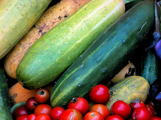 The first picture is of one of our dinners, pasta. The pasta's were different flavors which is why they are different colors. Squash, Spinach, and carrot. The second photo is a bunch of veggies that my parents grew in our backyard.